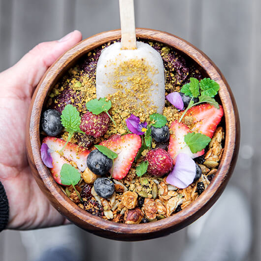 Dairy & sugar free acai ice-cream served with a serotonin toasted granola made with fruit & nuts. Topped with fresh mixed berries, pistachio dust & served with a house-made peanut butter, banana & coconut magnum ice-cream.